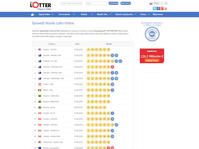 Niezależnie od narodowości, udział możesz wziąć w jednej z ponad 50 loterii. W ofercie znajdziesz na przykład amerykańską loterię Powerball, australijską Oz Lotto, hiszpańską El Gordo, włoską SuperEnalotto, węgierską Otoslotto, polską Lotto, rosyjską Gosloto 6/45, europejskie EuroJackpot, EuroMillions i wiele innych. Na stronie znajdziesz nie tylko szeroką ofertę, ale również wszystkie wyniki oraz historię w przejrzystej formie. Do dyspozycji masz także aplikacje mobilne (iPad, iPhone, Android), abyś zawsze miał aktualne informacje. Zaletą są z pewnością różne wersje językowe strony.